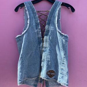 UNIQUE RECONSTRUCTED FRAYED DENIM BUTTON UP VEST LEATHER LACE-UP BACK HARLEY DAVIDSON EMBROIDERED LOGO
