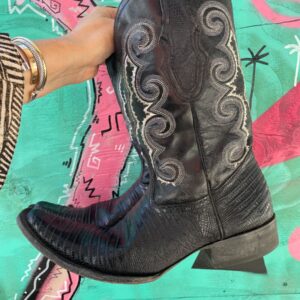 BLACK LEATHER & LIZARD SKIN CURVED TOE COWBOY BOOTS 2 TONE EMBROIDERY