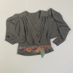 1970S WRAP CHIFFON STYLE BACK BUTTON BLOUSE BEADED TRIM & HEM