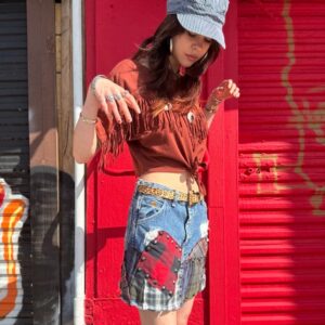 CUSTOM DISTRESSED STITCHED & STUDDED MULIT-PLAID TEXTILE SKIRT