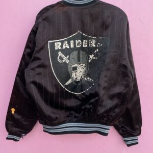 PINSTRIPE NFL RAIDERS FOOTBALL SNAP UP BOMBER JACKET W/ CRACKLED EMBLEM DOUBLE SIDED AS-IS