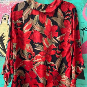 Y2K HIBISCUS FLORAL PRINT LONG SLEEVE BUTTON UP SHEER 100% SILK BLOUSE TOP RUFFLED COLLAR & HEMS