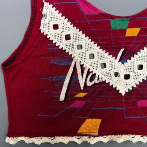 SO CUTE! REWORKED 1980S GRAPHIC CROPPED TOP ADDED CROCHET LACE APPLIQUE & TRIM