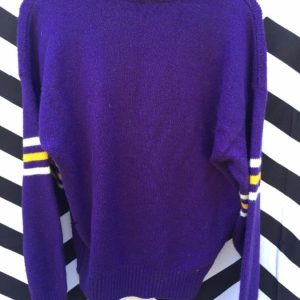 CLIFF ENGLE PULLOVER SWEATER, KNIT, LOS ANGELES LAKERS, STRIPED SLEEVES & HORIZONTAL STRIPE W/LAKERS LETTERING