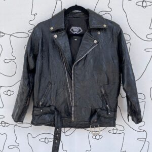 LEATHER PATCHWORK BELTED MOTO STYLE ZIP UP JACKET