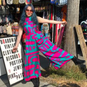 TEAL PINK SILK JUMPSUIT GEOMETRIC PATTERN
