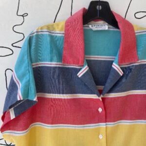 CUTE COLOR BLOCK HORIZONTAL STRIPED SHORT SLEEVE BUTTON DOWN BLOUSE