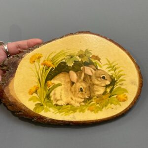 ADORABLE 1970S-80S BUNNY RABBIT WOOD SLICE HOME DECOR PIECE