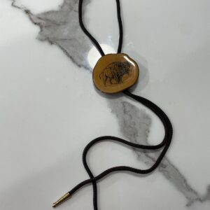 BUFFALO WOOD BURN RESIN BROWN WOVEN ROPE GOLD TIPS BOLO TIE