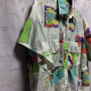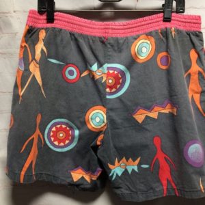 1980’S SWIM TRUNKS ELASTIC WAIST W/ GEOMETRIC PATTERNS & PEOPLE PRINT