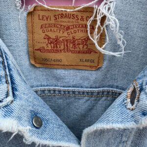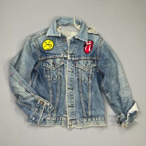 SUPER RAD THRASHED BIG E LEVIS DENIM JACKET W/ VINTAGE PATCHES