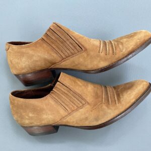 LIGHTLY DISTRESSED TAN SUEDE LEATHER EMBROIDERED DESIGN WINKLEPICKER COWBOY BOOTIES