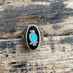 CRUSHED TURQUOISE & ONYX EAGLE ON PERCH MOTORCYCLE BIKER RING