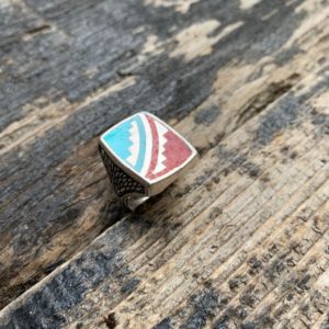 TRIBAL DESIGN CRUSHED TURQUOISE & RED CORAL RING MENS MOTORCYCLE BIKER RING