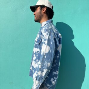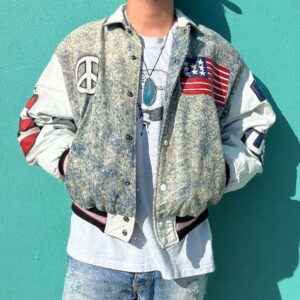 AMAZING 1980S ACID WASH DENIM AMERICAN PEACE FLAG VARSITY JACKET WITH LEATHER SLEEVES