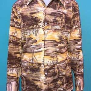 1970S COMBED COTTON POLY LONG SLEEVE BUTTON DOWN ALLOVER BOAT PRINT SHIRT