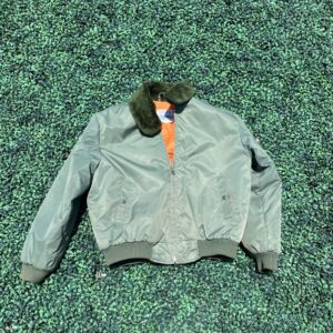 OLIVE GREEN & ORANGE QUILTED LINING NYLON ZIP UP BOMBER JACKET FAUX FUR COLLAR ACCENT