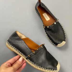 BLACK PEBBLED LEATHER ROCK STUDDED JUTE SOLE SLIP ON SHOES