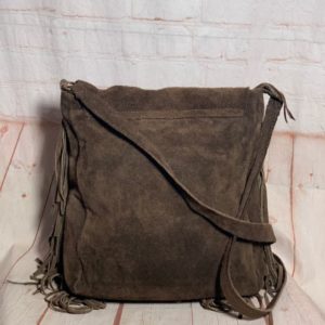 1970’S STYLE SUEDE MESSENGER BAG W/ FLAP CLOSURE & FRINGE AROUND EDGE