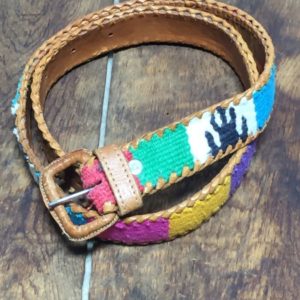 MULTI-COLORED WOVEN BELT W/ LEATHER BACKING/END/COVERED BUCKLE & WHIPSTITCHED EDGES