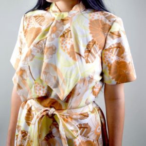 1970’S DAY DRESS FLORAL PRINT MULTI-COLOR W/ PUSSY BOW