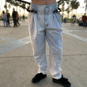 AMAZING EARLY 90S HIGH WAISTED PAPER BAG WAIST JEANS ACID WASH DENIM PLAID PATCHWORK POLY COTTON BLEND
