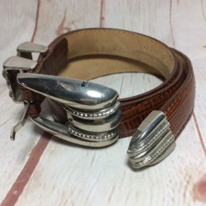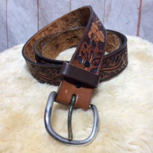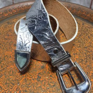 LEATHER BELT SILVER METALLIC EMBOSSED FLOWERS SILVER BUCKLE