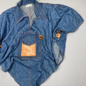 *AS-IS* 1990S UNUSUAL DENIM COLLARED PONCHO W/ LEATHER ACCENTS & BRASS SNAP BUTTONS