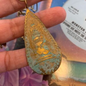 OXIDIZED BRASS TEAR DROP PENDANT W/ EGYPTIAN HIEROGLYPHIC DESIGN NECKLACE