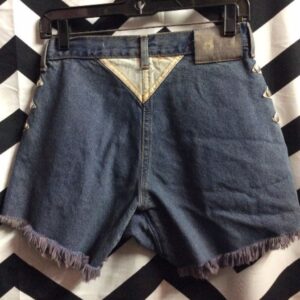 DENIM SHORTS – TRIANGLE PATCH APPLIQUES’ – FRAYED