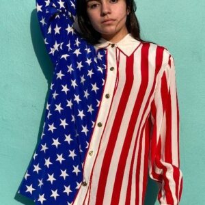 100% SILK AMERICANA STAR SPANGLED STRIPED LONG SLEEVE BUTTON UP BLOUSE GOLD BUTTONS