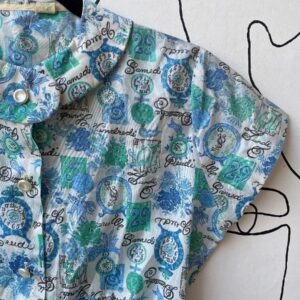ADORABLE 1950S PRINTED FRENCH TYPOGRAPHY & CLOCKS SHORT SLEEVE CROPPED BUTTON UP BLOUSE