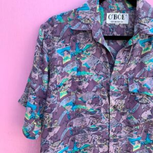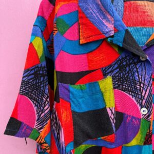 1990S BRIGHT FUNKY POLY BOWLING SHIRT W/ BOWLING BALL PATCH