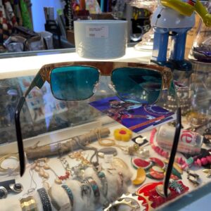 RAD CUSTOMIZED 1980S DEADSTOCK STRAIGHT BROW GOLD NUGGET BLUE TINTED SUNGLASSES