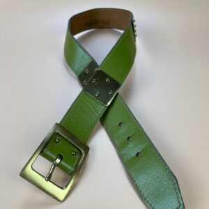 RETRO STYLE PEA GREEN LEATHER BELT WITH BRASS RIVETED PLATE ACCENTS