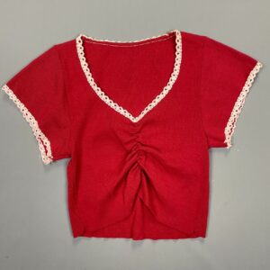 SOO CUTE!!! 1970S LACE TRIM STRETCHY RIBBED TOP RUCHED FRONT