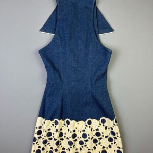CUSTOM MADE 1970S SLEEVELESS COLLARED ZIP UP DENIM MINI DRESS EMBROIDERED BOTTOM