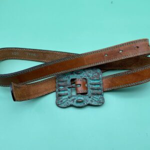 AMAZING! 1990S NARROW LEATHER BELT OVERSIZED OXIDIZED PATINA BUCKLE