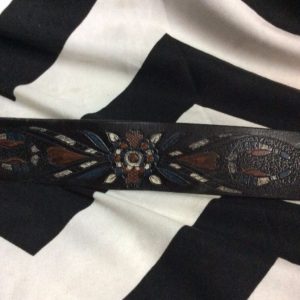 VINTAGE JUSTIN BELT EMBOSSED & PAINTED LEATHER WIDE W/HEAVY BRONZE BUCKLE