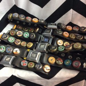 BELT – SEAT BELT BUCKLE – ADORNED W/BEER BOTTLE CAPS