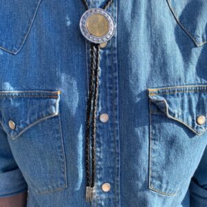 TWO TONED US GOLD ONE DOLLAR COIN INLAY CIRCULAR PENDANT BOLO TIE BLACK LEATHER WOVEN CORD