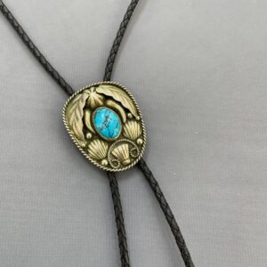 MADE IN MEXICO ETCHED SILVER SHELL & LEAF DESIGN BOLO TIE TURQUOISE STONE INLAY BLACK LEATHER WOVEN CORD BOLO TIE