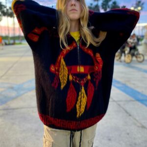 SOFT WOOL FULL ZIP UP DREAMCATCHER DESIGN SWEATER JACKET SOUTHWESTERN WITH POCKETS HOOD AND DRAWSTRING WAIST MADE IN ECUADOR
