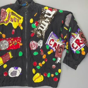 AMAZING! 1990S ALLOVER SEQUINED CANDY THEMED ZIP UP BRUSHED TWILL JACKET