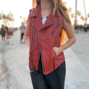 RED LEATHER MOTO STYLE COLLARED ZIP-UP VEST