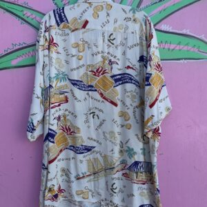 COOL! 100% RAYON, ISLAND TRADER PRINT HAWAIIAN SHIRT, COCONUT BUTTONS