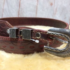 EMBOSSED GEOMETRIC PATTERN LEATHER BELT WITH 925 STERLING SILVER BUCKLE, LOOP AND TIP *SIGNED