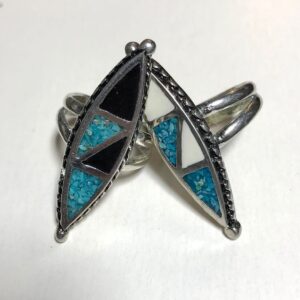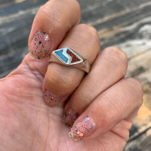 CRUSHED TURQUOISE AND CORAL DIAMOND SHAPED GEOMETRICAL INLAY SILVER RING