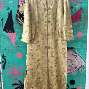 *AS-IS* BEAUTIFUL CRANE PRINT GOLD SILK BROCADE LONG BUTTON UP KIMONO STYLE JACKET WITH POCKETS