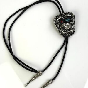 HEAVY ORNATE EAGLE HEAD BOLO TIE, TURQUOISE & CORAL STONES, BRAIDED LEATHER CORD